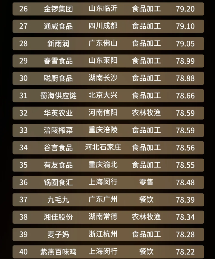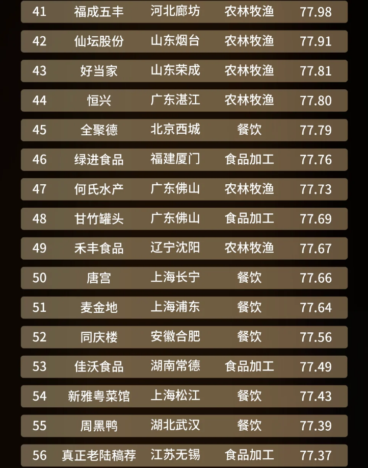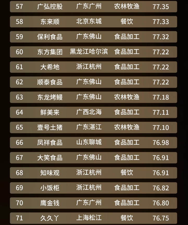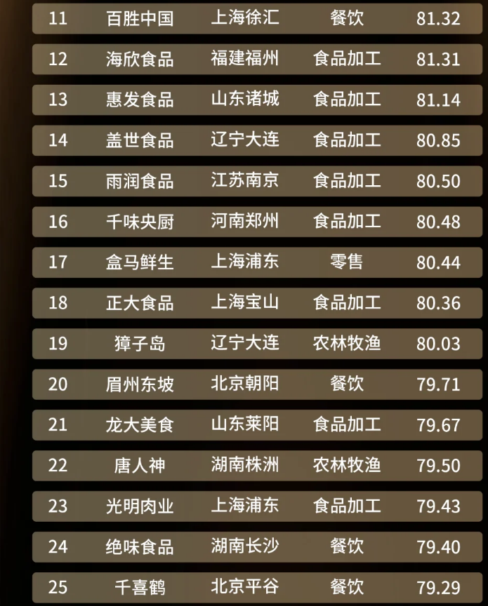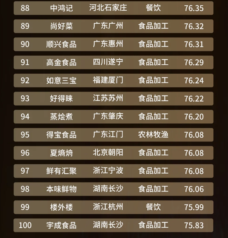 本次榜单共有100个企业上榜,排在榜单前10名的品牌分别是:双汇集团、海底捞、温氏食品、圣农发展、新希望、得利斯、金字火腿、广酒利口福、味知香、国联水产。其中,双汇集团以84.36的评分位居榜单第一,海底捞(83.35)、温氏食品(83.06)分列第二、第三。