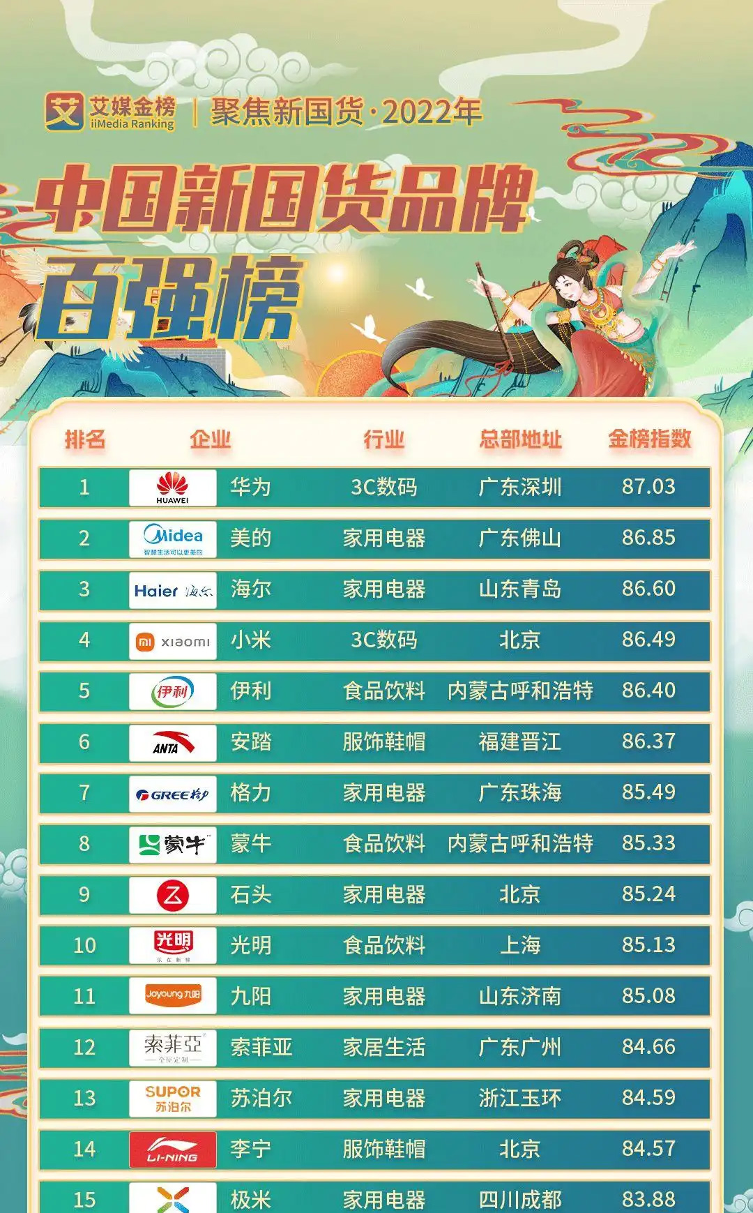 本次新国货榜单共有100个品牌上榜,其中,排在榜单前20名的品牌分别是:华为、美的、海尔、小米、伊利、安踏、格力、蒙牛、石头、光明、九阳、索菲亚、苏泊尔、李宁、极米、波司登、科沃斯、大疆、五芳斋、名创优品。