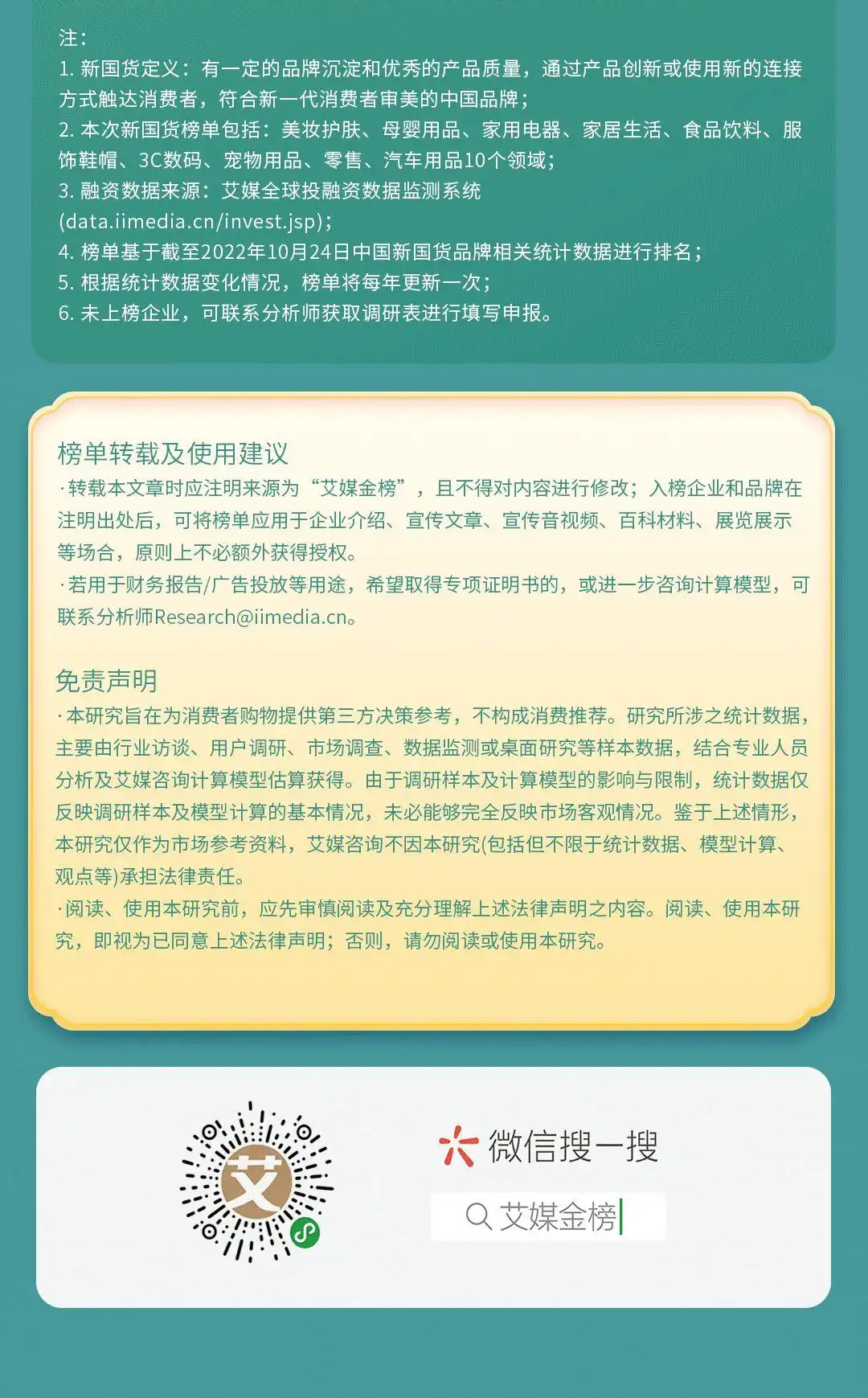本次新国货榜单涵盖了美妆护肤、母婴用品、家用电器、家居生活、食品饮料、服饰鞋帽、3C数码、宠物用品、零售、汽车用品10个领域。新国货指有一定的品牌沉淀和优秀的产品质量,通过产品创新或使用新的连接方式触达消费者,符合新一代消费者审美的中国品牌。